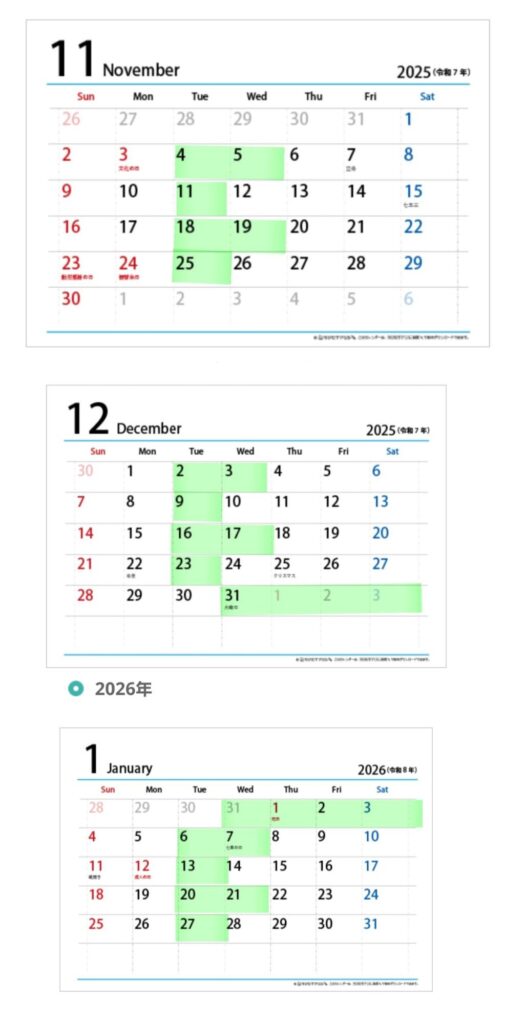 11、12、1月の定休日になります。